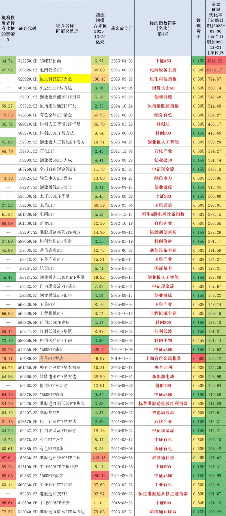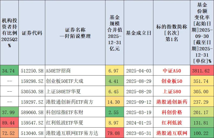 相较于三季报基金份额变化率超100%的ETF,剔除被迫指数型债券基金,2025Q4磋商大于2亿元,筛选出炉51只基金。
