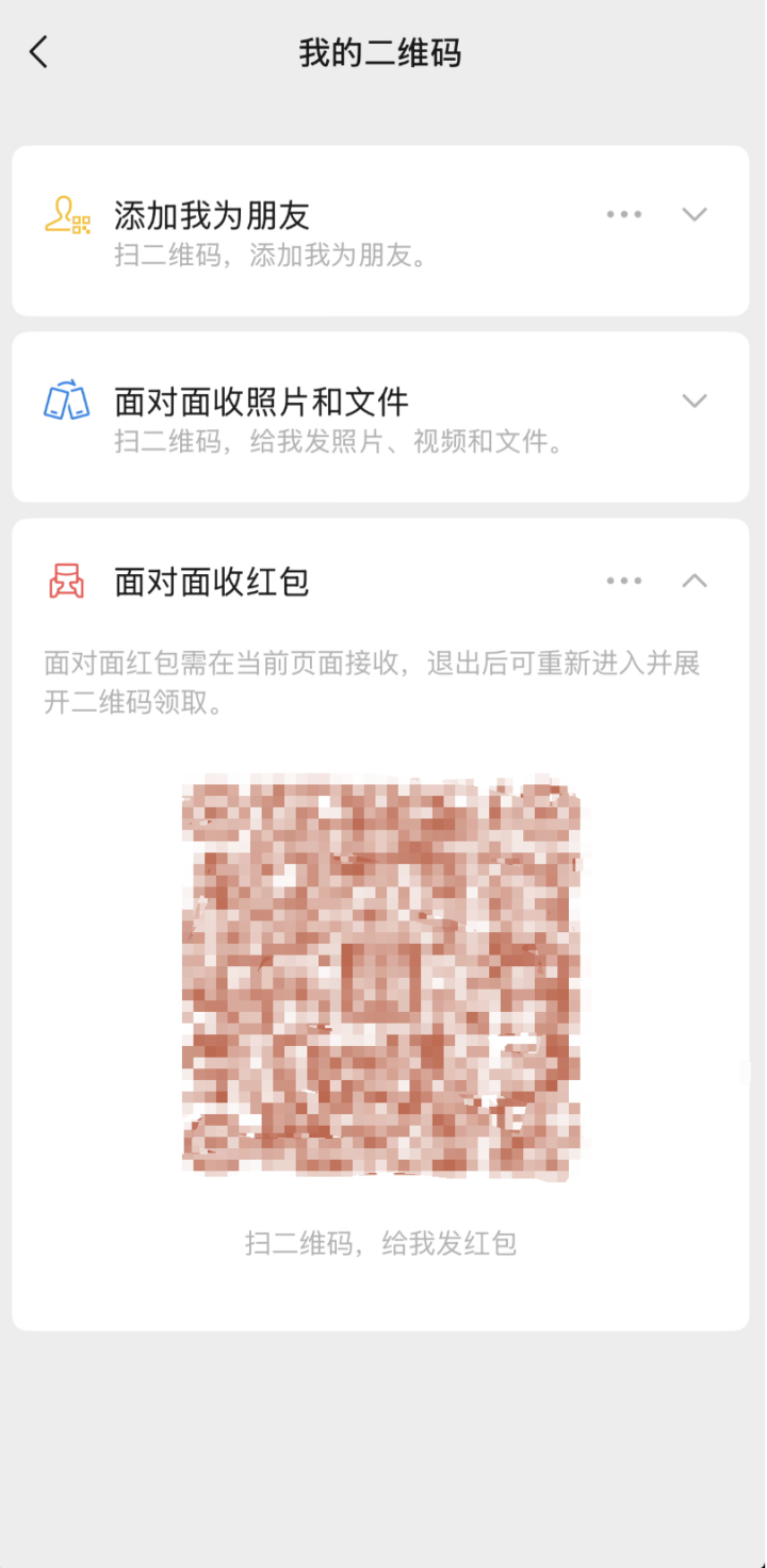 咱们会发现除了“添加我为一又友”的选项外,多了“濒临面收像片和文献”、“濒临面收红包”等两个选项,咱们不错把柄我方的需求进行点击使用,出现二维码后,让好友使用微信径直扫码即可完成。