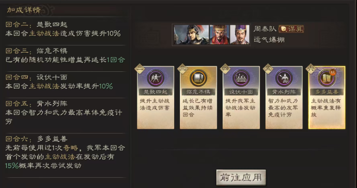 周泰:潜龙阵、白马义从。兵书,诱敌之策、掩虚、励军袁术:转狮子奋迅、上兵伐谋。兵书,蛮勇非勇,抓锐,文韬荀攸:绝计折谋、焚锱营垒。兵书,胜而益强、胜战、文韬.