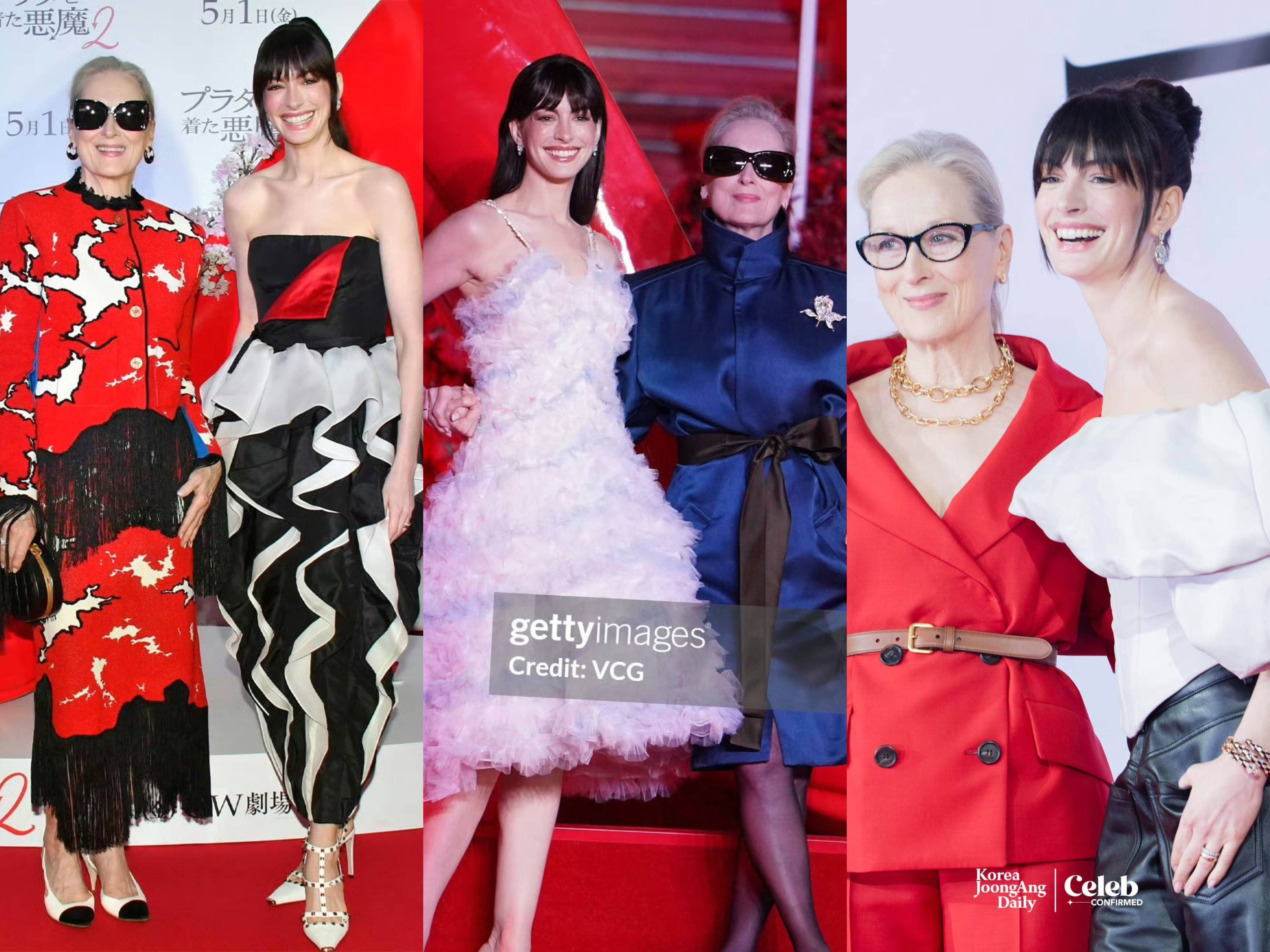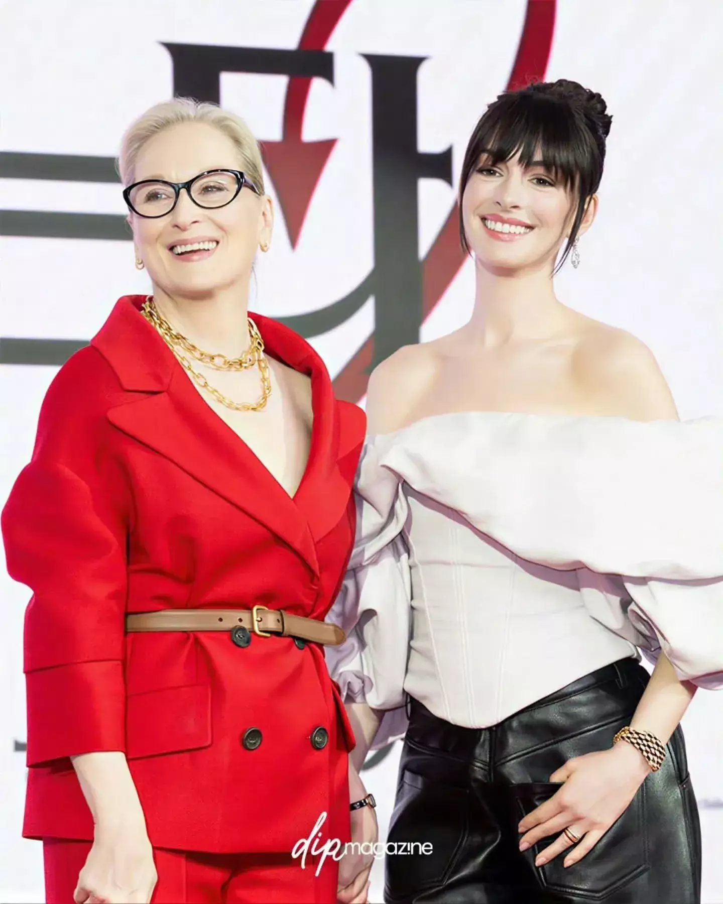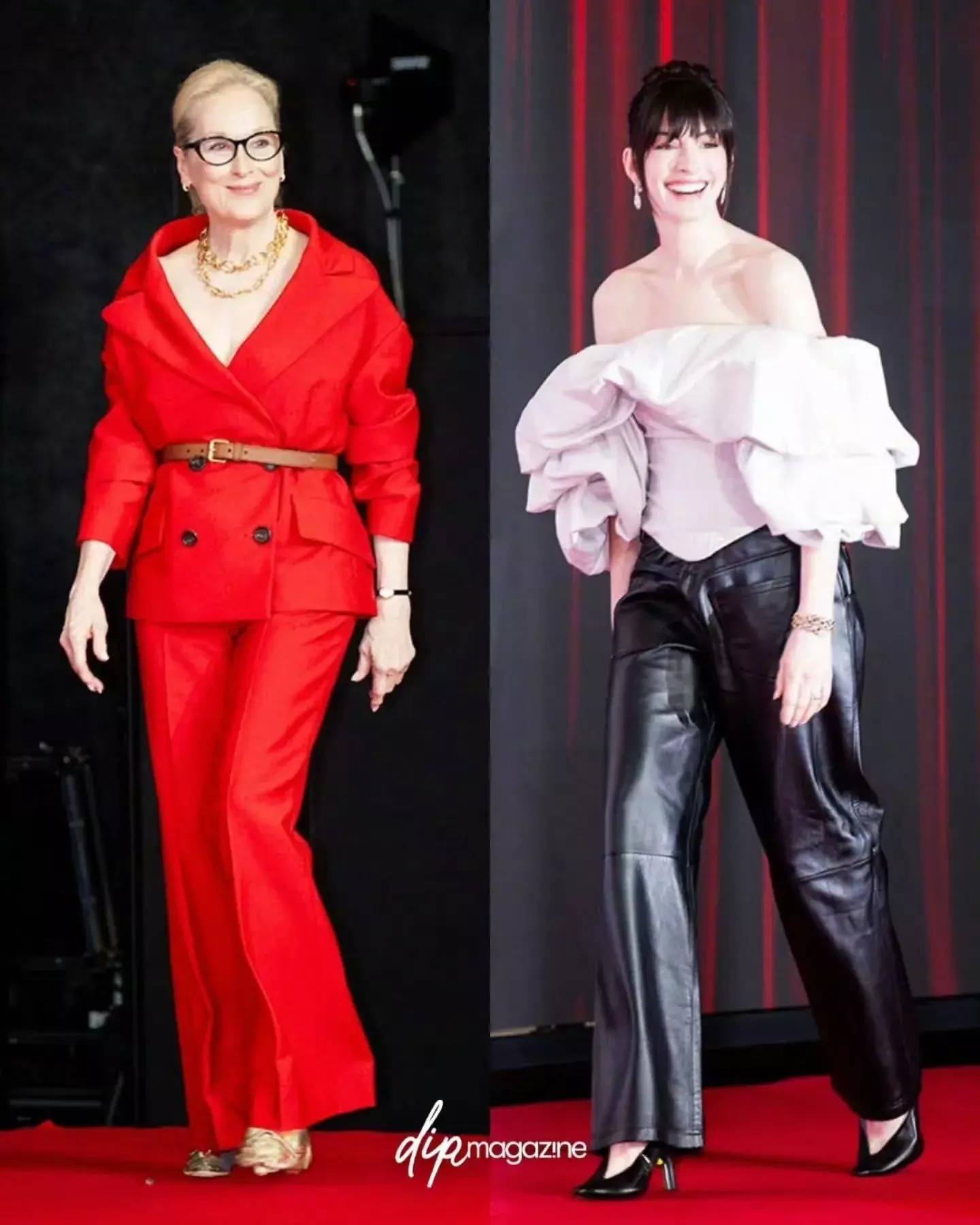 梅丽尔·斯特里普和安妮.海瑟薇现身韩国媒体碰头会时则是一个历害红,一个短长配!安妮·海瑟薇皆刘海高扎丸子头,像极了公主!身穿白色一字肩上衣搭配玄色皮裤,脚穿Balenciaga 缎面高跟鞋。
