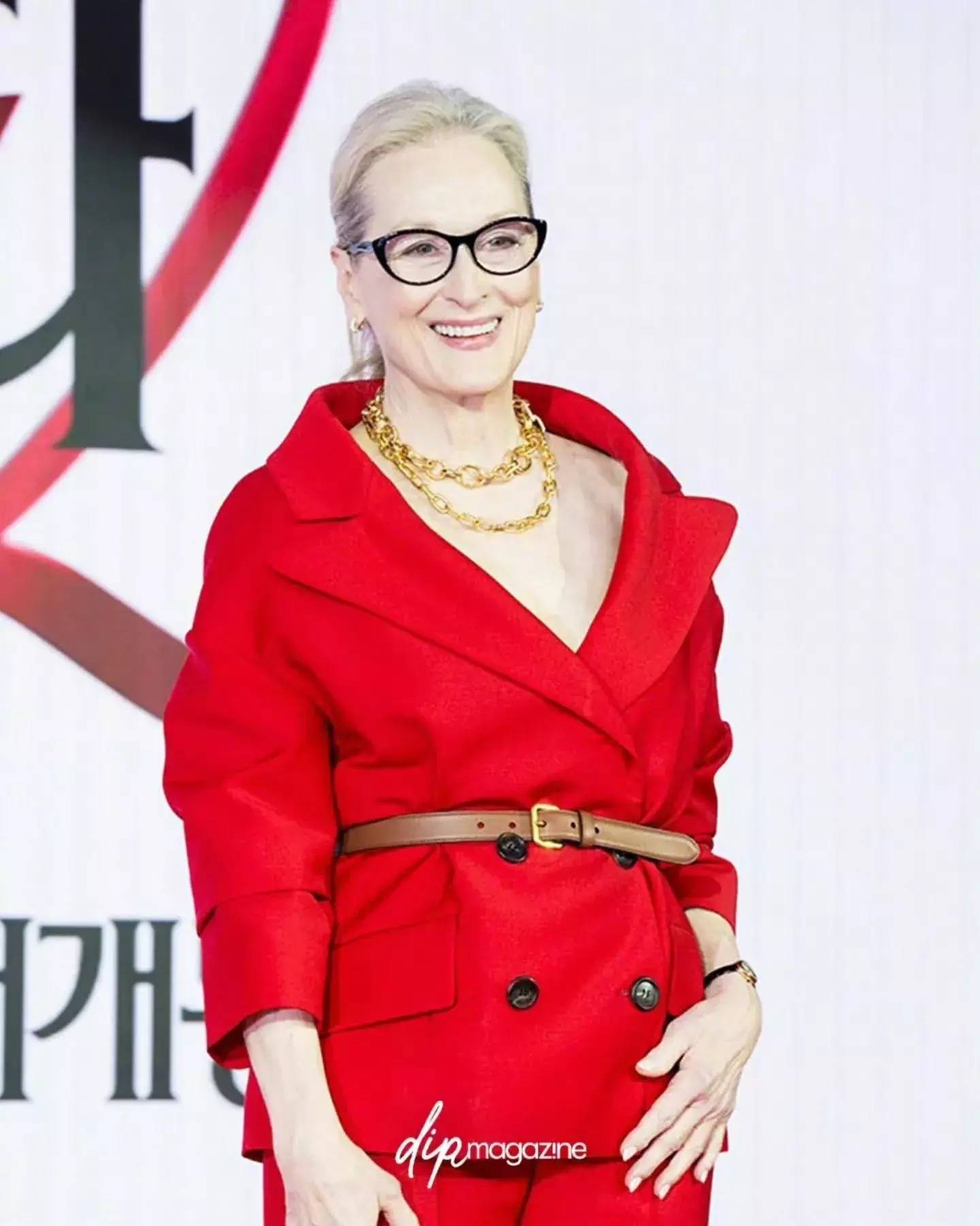 红色西装搭配棕色腰带,让东说念主感受到了优雅老去的魔力!
