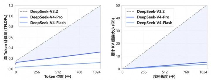 DeepSeek-V4和DeepSeek-V3.2的计较量和显存容量随凹凸文长度的变化