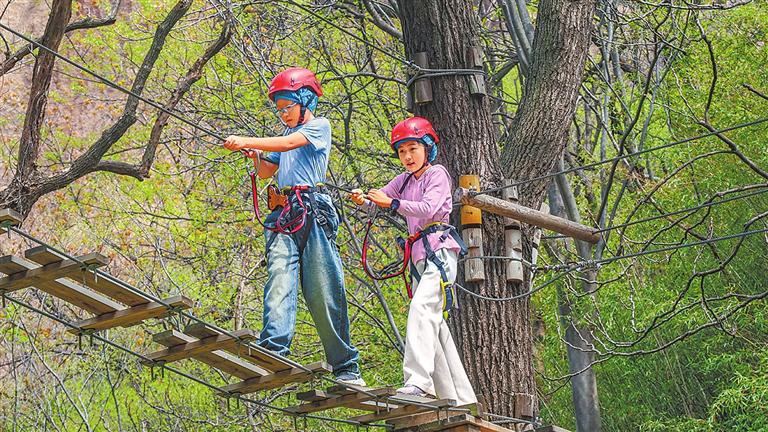 搭客在嵖岈山“树顶攀跃”神志中挑战高空步谈。