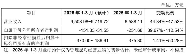 有研复材瞻望2026年第一季度营收为9509万到9720万元,较上年同时的6588万元增长44.34%到47.53%;瞻望净利为-152万到32万,瞻望扣非后净利为-370万到-187万元。