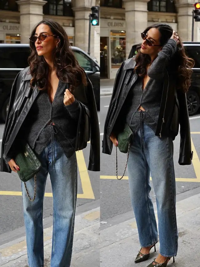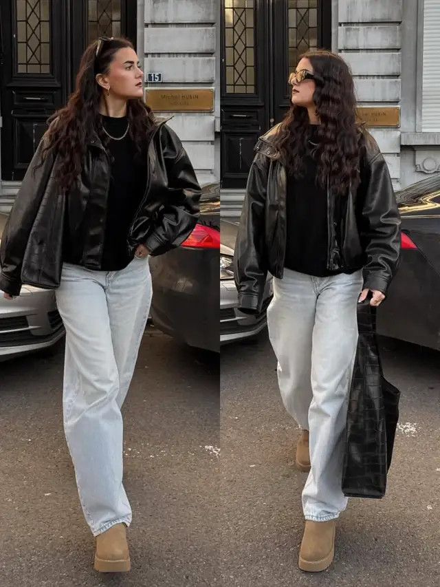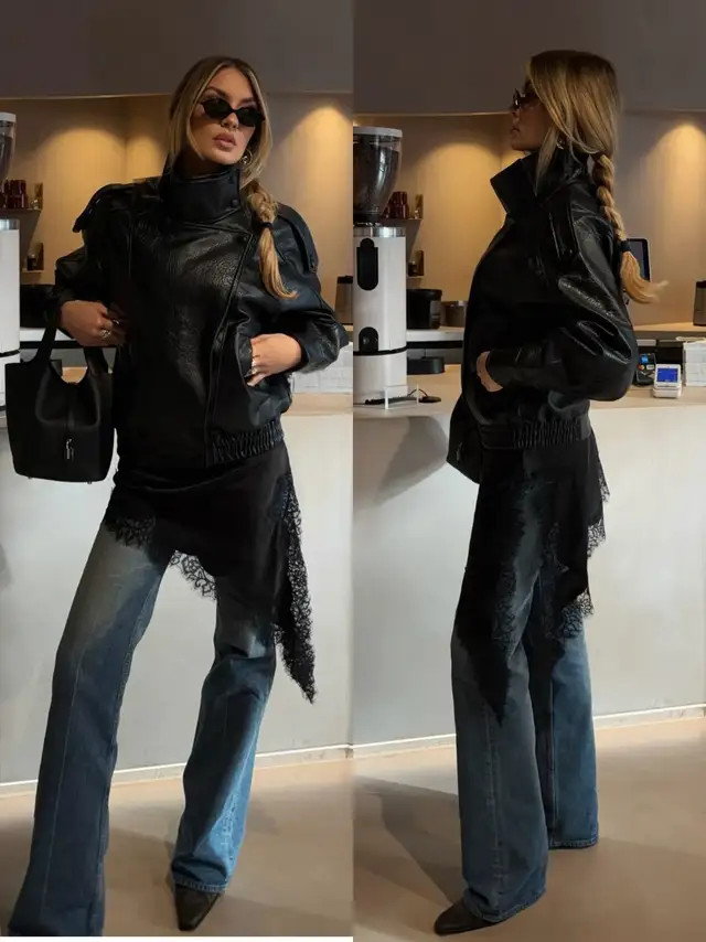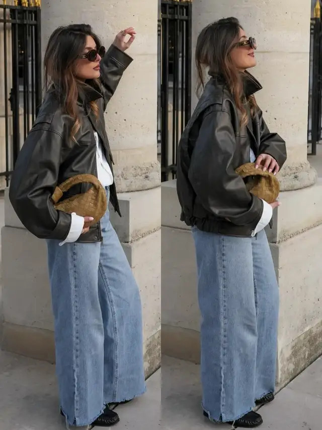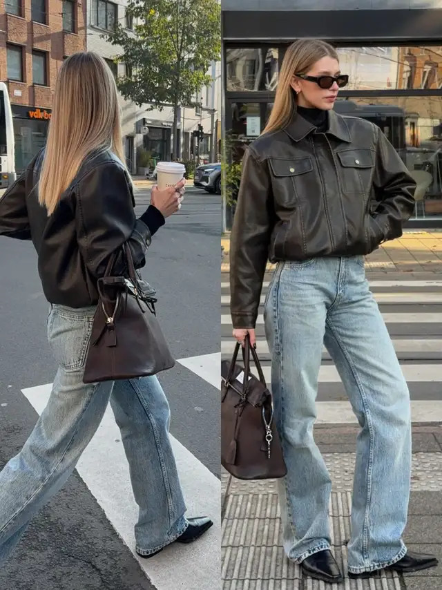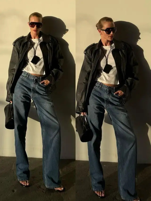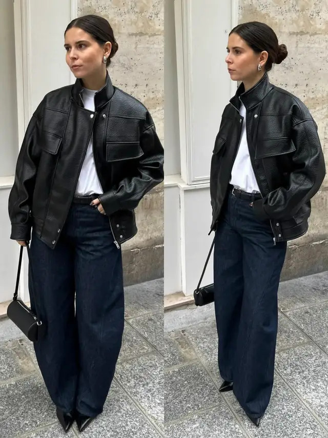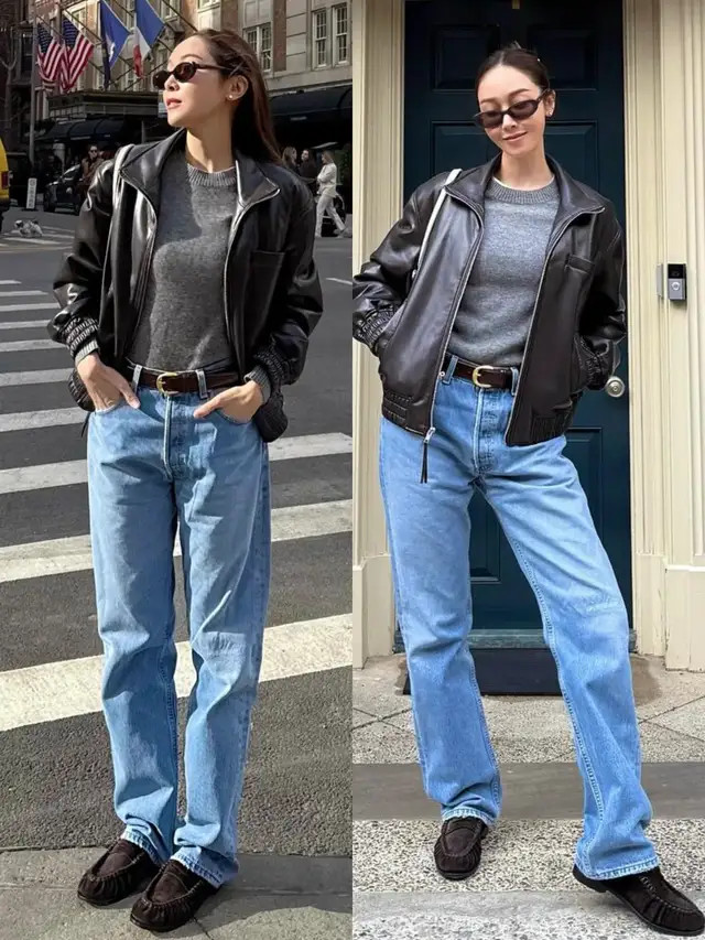 正常偏疼闲静的情况下,我个东说念主更保举大家弃取短款的玄色皮衣外衣,内搭一件衬衫和一条牛仔直筒阔腿裤,脚上穿的是玄色的乐福鞋,这样的打扮既慵懒又闲静洋气。