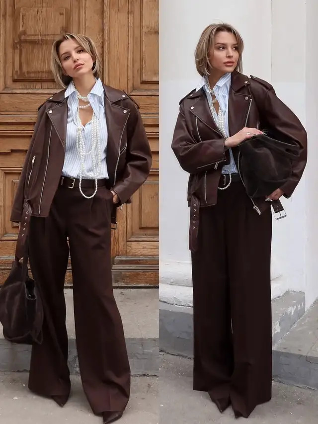 或是弃取棕色的皮衣外衣搭配上棕色的西装直筒阔腿裤,内搭一件蓝色的条纹衬衫,这样搭配形状既干练又通勤娴雅,慵懒纰漏。