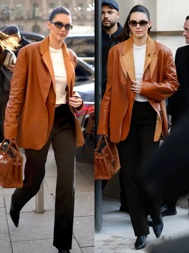 春天,本便是皮衣的主场。像上头用驼色的皮衣外衣,内搭白色 T 恤,加上一条玄色的直筒西裤,脚上穿的玄色的短靴,走起路来自带风,又飒又好意思。