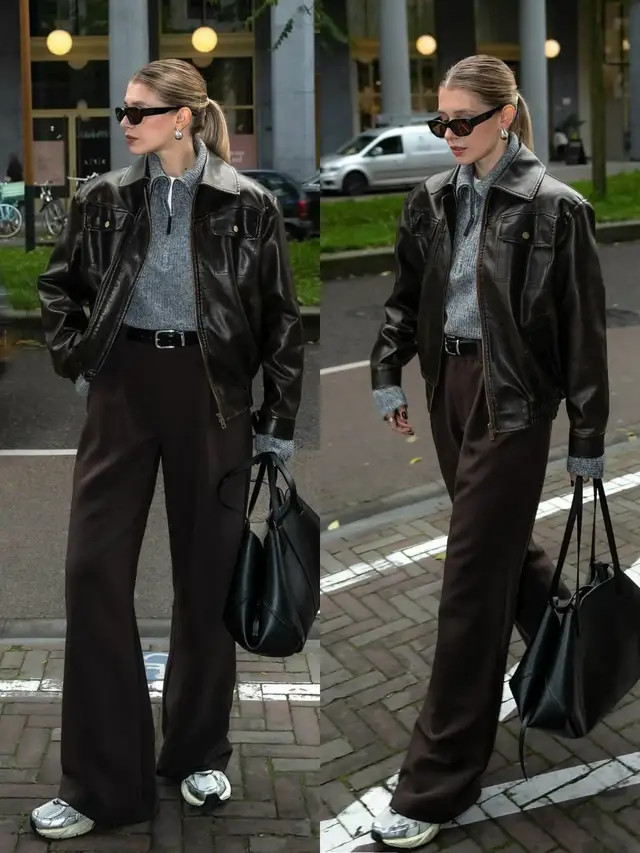 正常穿搭其实我更偏疼上头这种搭配形状,用一对老爹鞋配上棕色的直筒西裤,外搭一件棕色的皮衣外衣,内搭灰色毛衣,这样的穿搭形状既闲静又洋气,况兼显得干练,穿去上班、逛街、约聚、旅游、拍照齐很出片。