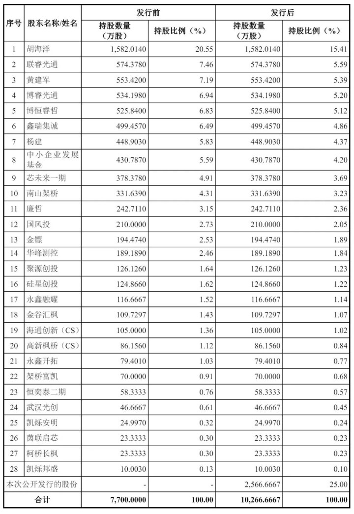 IPO后,胡海洋捏股15.41%,联睿光通捏股5.59%,黄建军捏股5.39%,博睿光通捏股5.2%,博恒睿哲捏股5.12%,鑫瑞集诚捏股为4.86%,杨建捏股为4.37%,中小企业发展基金捏股为4.2%,芯往时一期捏股3.69%;