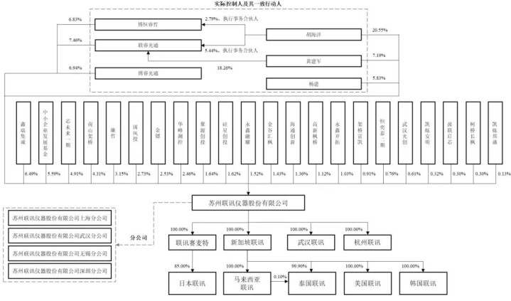 IPO前,胡海洋凯旋捏有公司20.55%的股份,并通过其担任实践事务合鼓动说念主的职工捏股平台联睿光通、博恒睿哲区别转折限度公司7.46%、6.83%的股份,揣摸限度公司34.83%的股份,系联讯仪器控股鼓动。