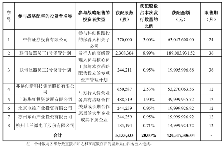 联讯仪器策略配售投资者区别为中信证券投资有限公司、联讯仪器职工1号资管权术、联讯仪器职工2号资管权术、兆易立异科技集团股份有限公司、上海华虹投资发展有限公司、北京电控产业投资有限公司、苏州东山产业投资有限公司、杭州士兰微电子股份有限公司,一共认购4.2亿元。