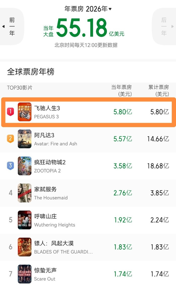 《飞奔东说念主生3》暂居年度民众票房榜首